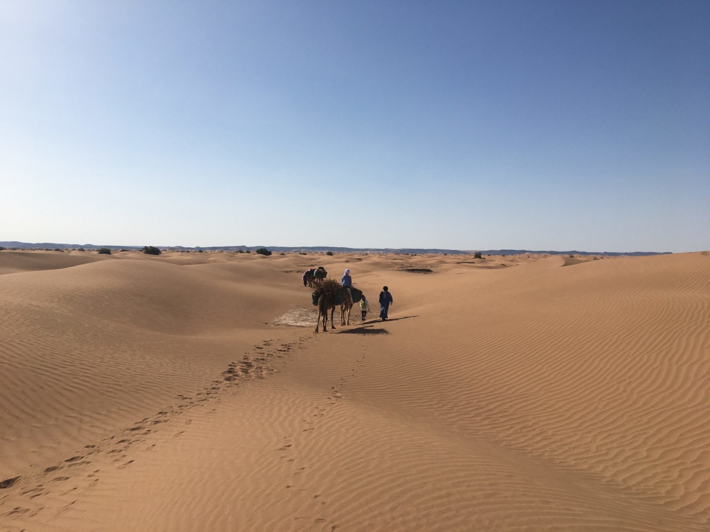La caravane poursuit son chemin à travers le désert de sable jusqu’aux grandes dunes de l’Erg Zahar : La Dune Hurlante.